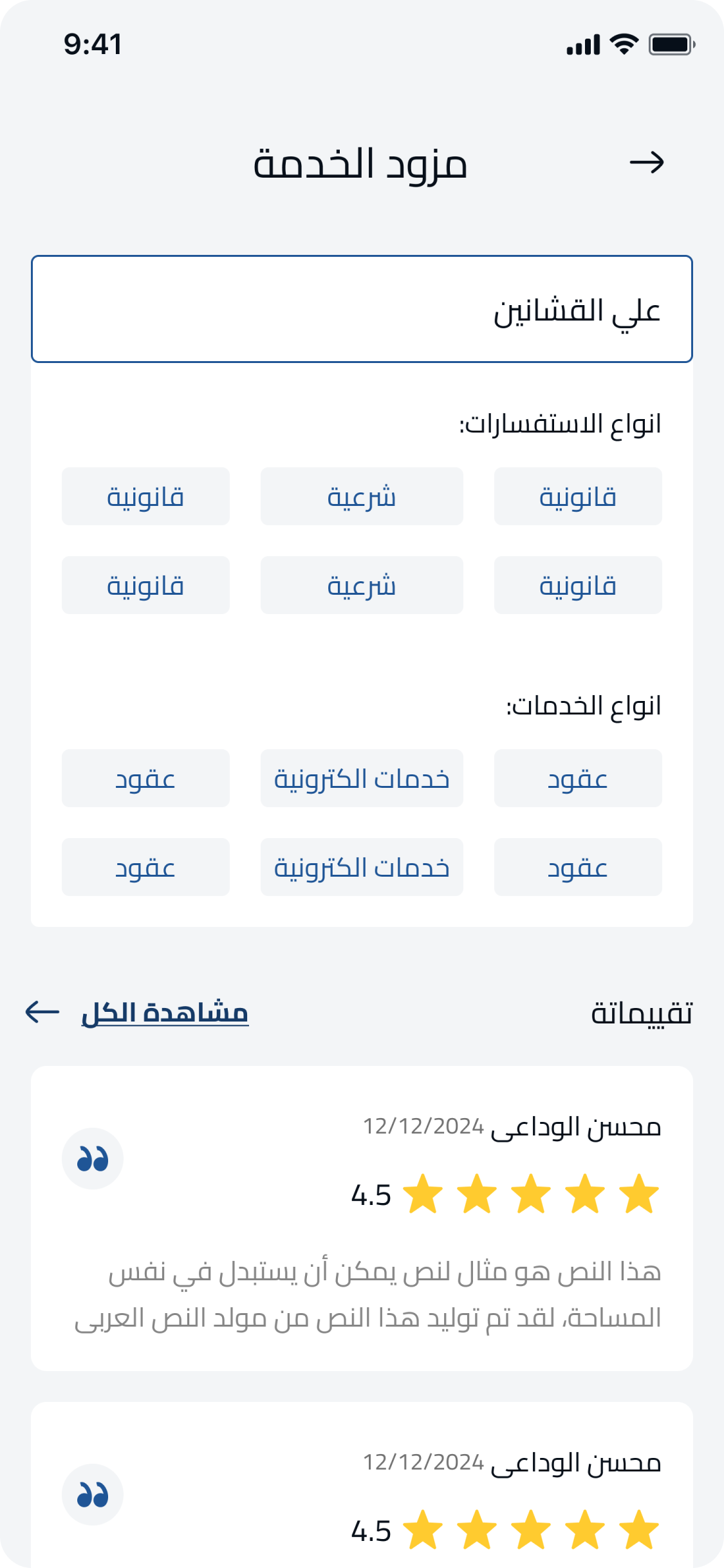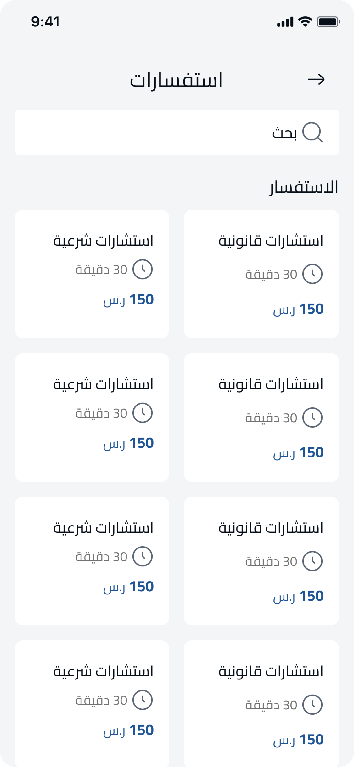 اختر بين قسم "استفسار" أو "تنفيذ خدمة" بناءً على احتياجك القانوني، واختيار الخدمة المناسبة.